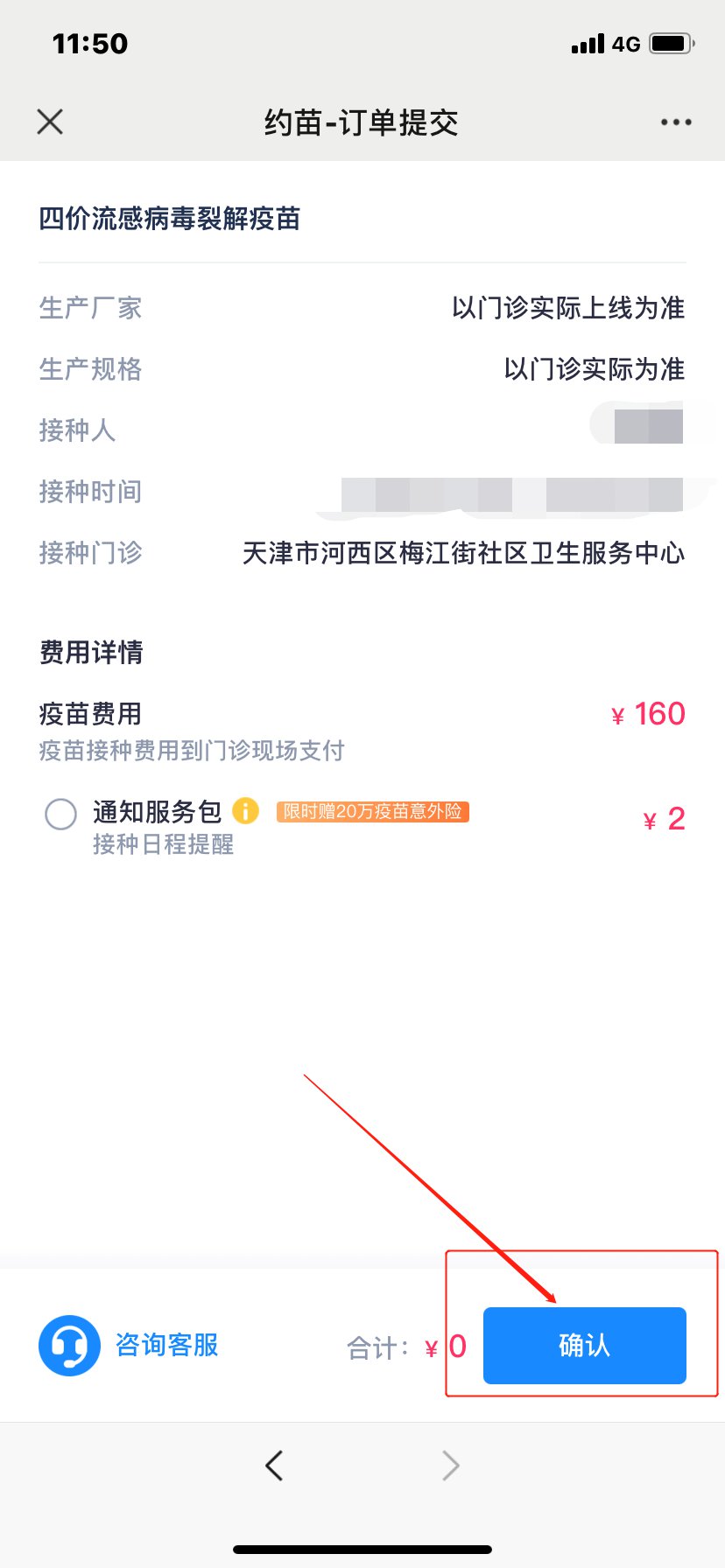 8、提交订单,检查接种人、接种日期、费用是否正确,点击确认即可。
