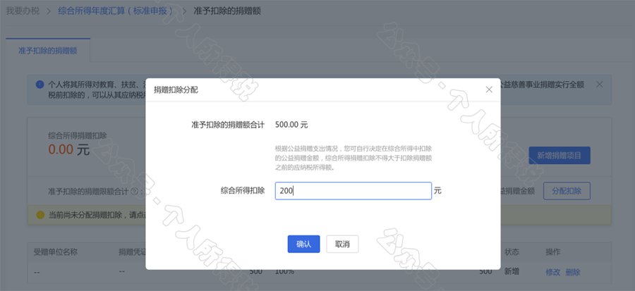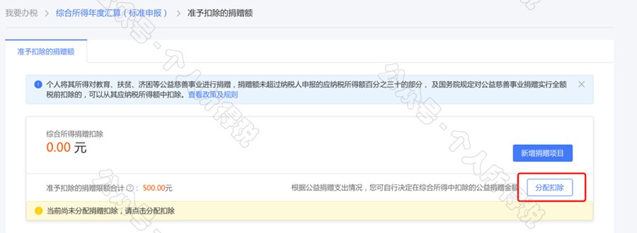新增捐赠额后,可点击【分配扣除】设置您要在综合所得中扣除的金额。