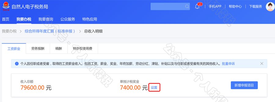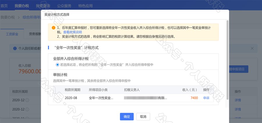年度汇算时,如纳税人选择将全年一次性奖金合并至综合所得计税的,或者有多笔全年一次性奖金的,可通过【单独计税奖金-设置】进行设置。