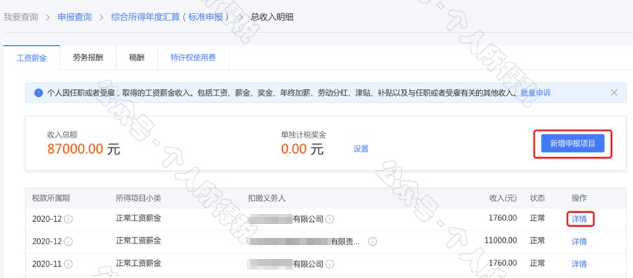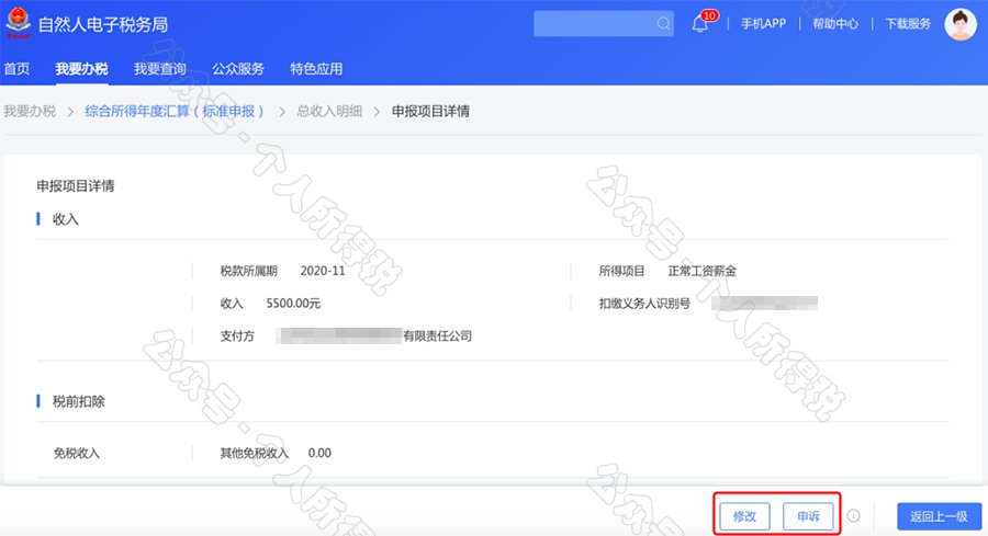 点击除专项附加扣除之外的明细数据可进入对应详情界面,您可进行【新增】、【修改】、【申诉】等操作,步骤同前一步的(一)完善收入数据一致。