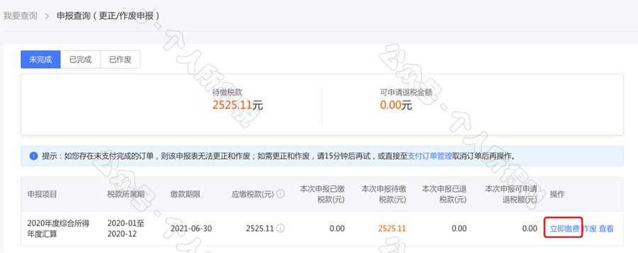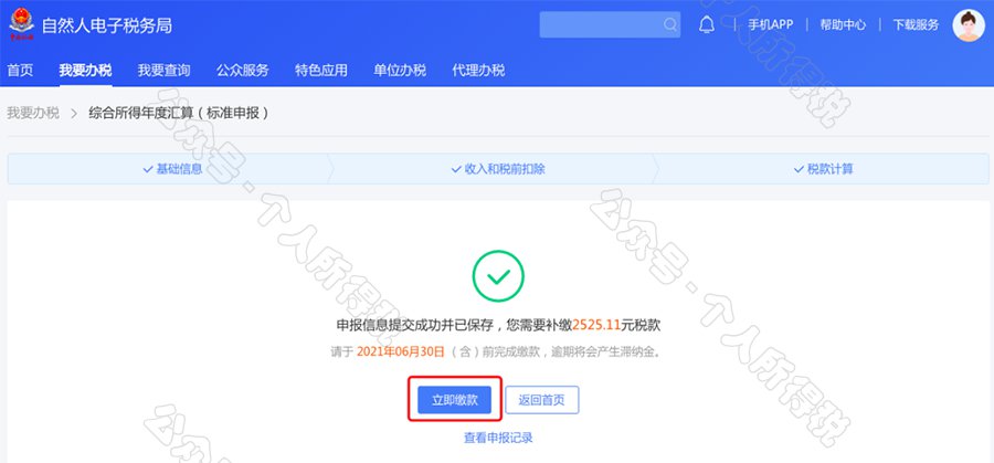 若您存在应补税额但不符合免于申报,可点击【立即缴款】。