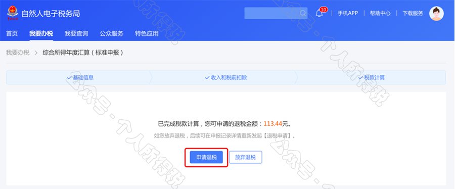 二是从顶部菜单【我要办税】-【税费申报】下的【年度汇算(仅取得境内综合所得适用)】进入。