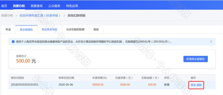在其他扣除明细列表界面,您可点击【商业健康险】、【税收递延养老保险】页面,分别进行新增和修改。