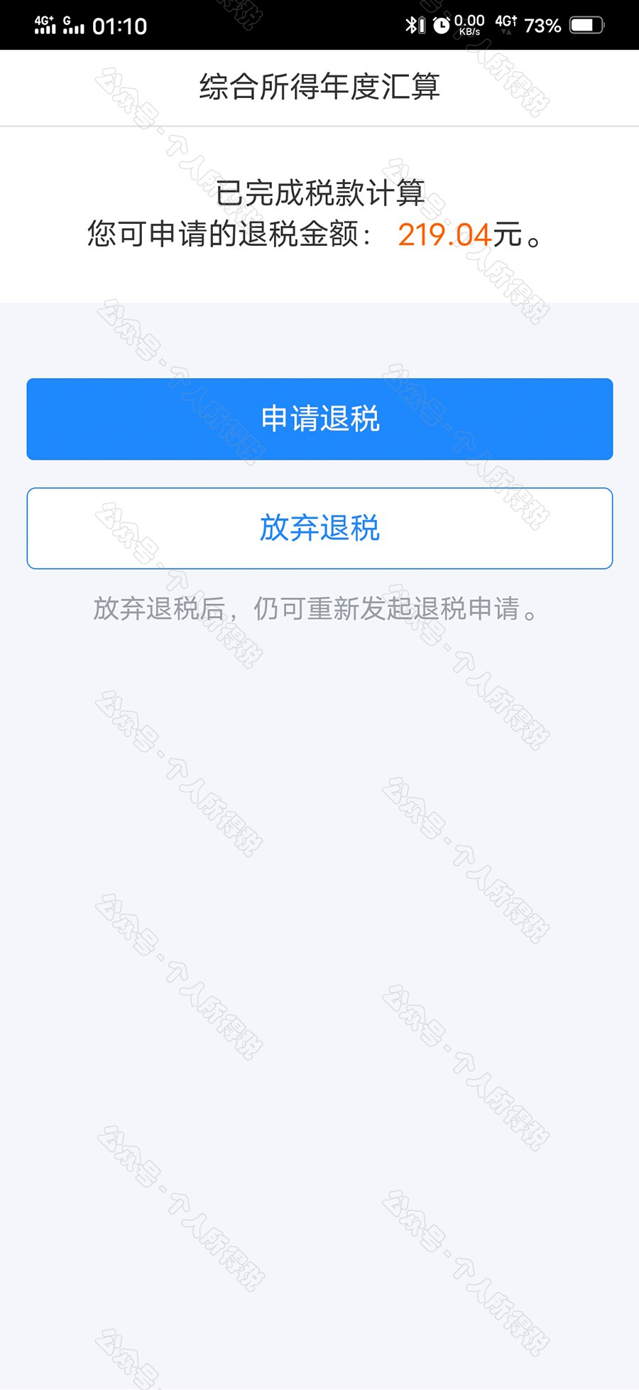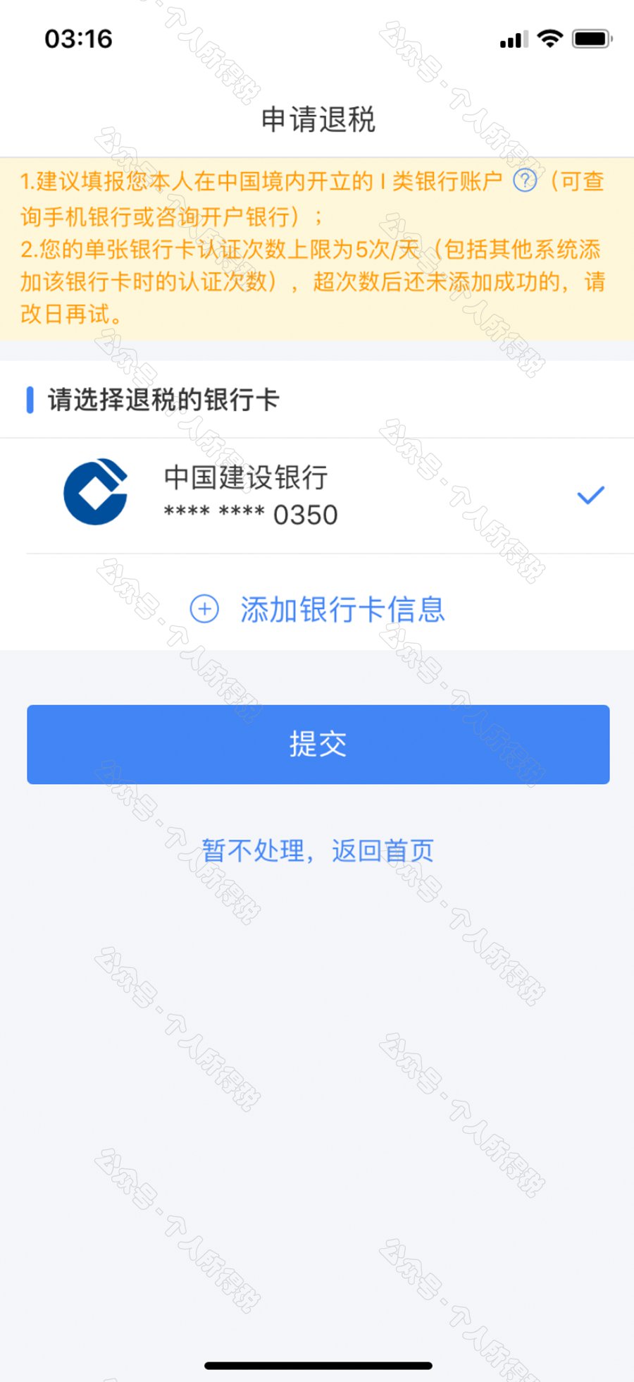 如果您的银行卡不在身边,或者暂时不想退税,可以点击【暂不处理,返回首页】,后续可再次发起退税申请。