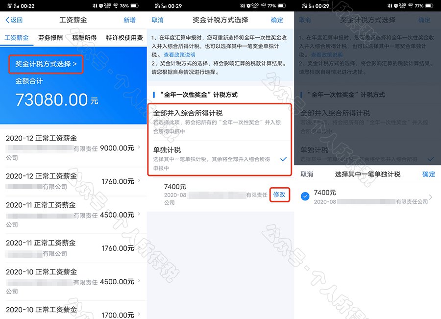 年度汇算时,如您选择将全年一次性奖金合并至综合所得计税的,或者有多笔全年一次性奖金的,可通过【奖金计税方式选择】进行设置。