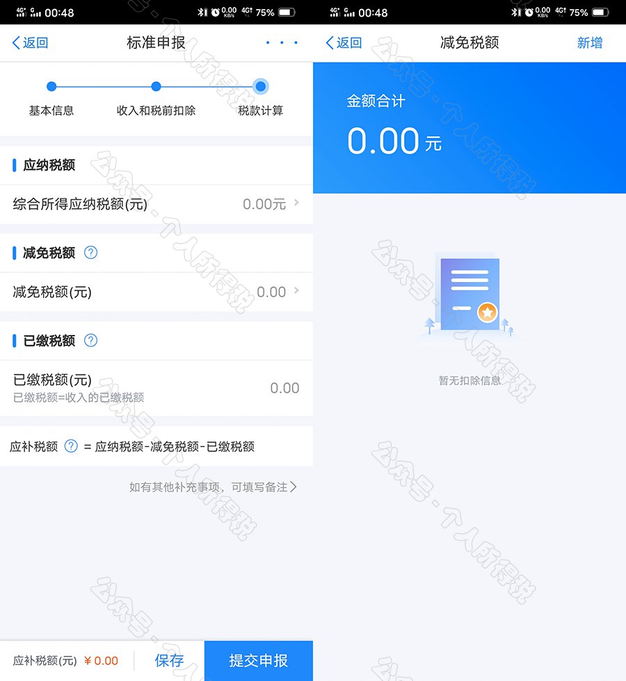 如您有减免税事项(残疾、孤老人员、烈属),可以点击【减免税额】新增相关信息。确认结果后,点击【提交申报】。