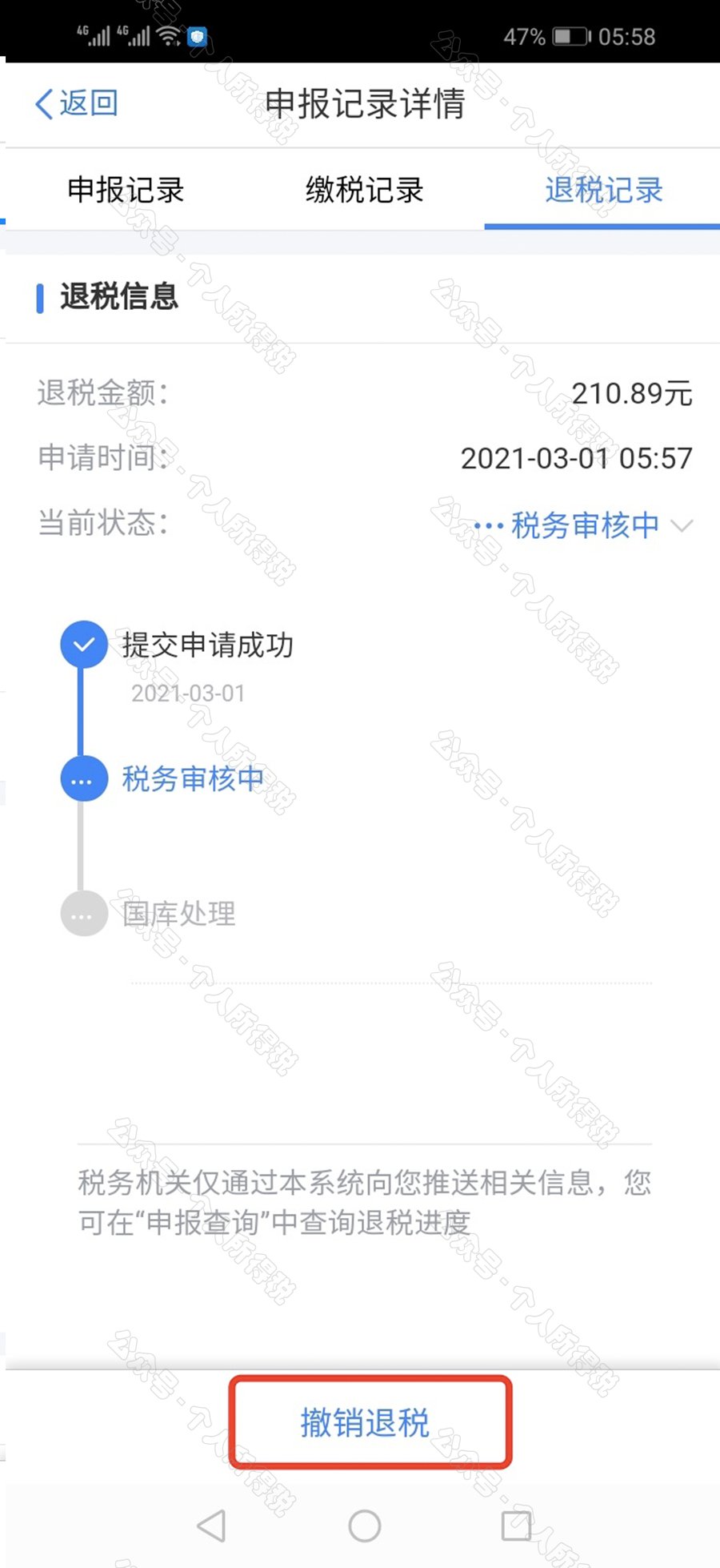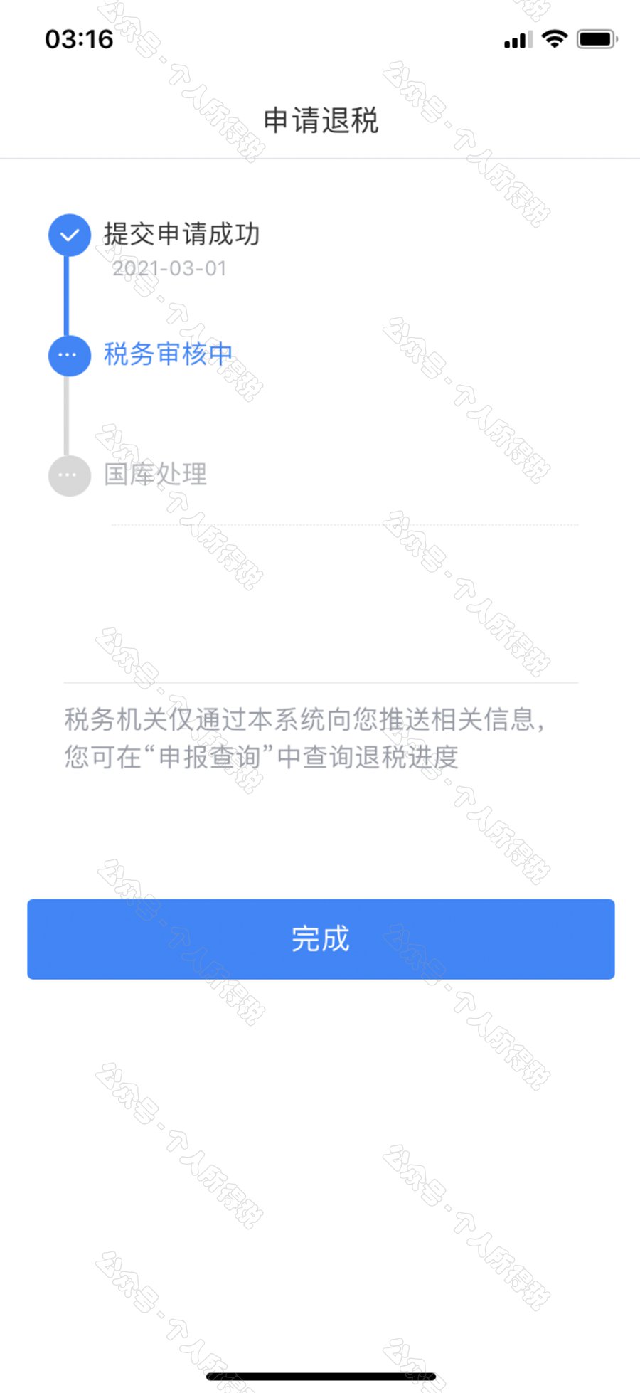 选择银行卡后提交退税申请,可以看到退税申请进度。
