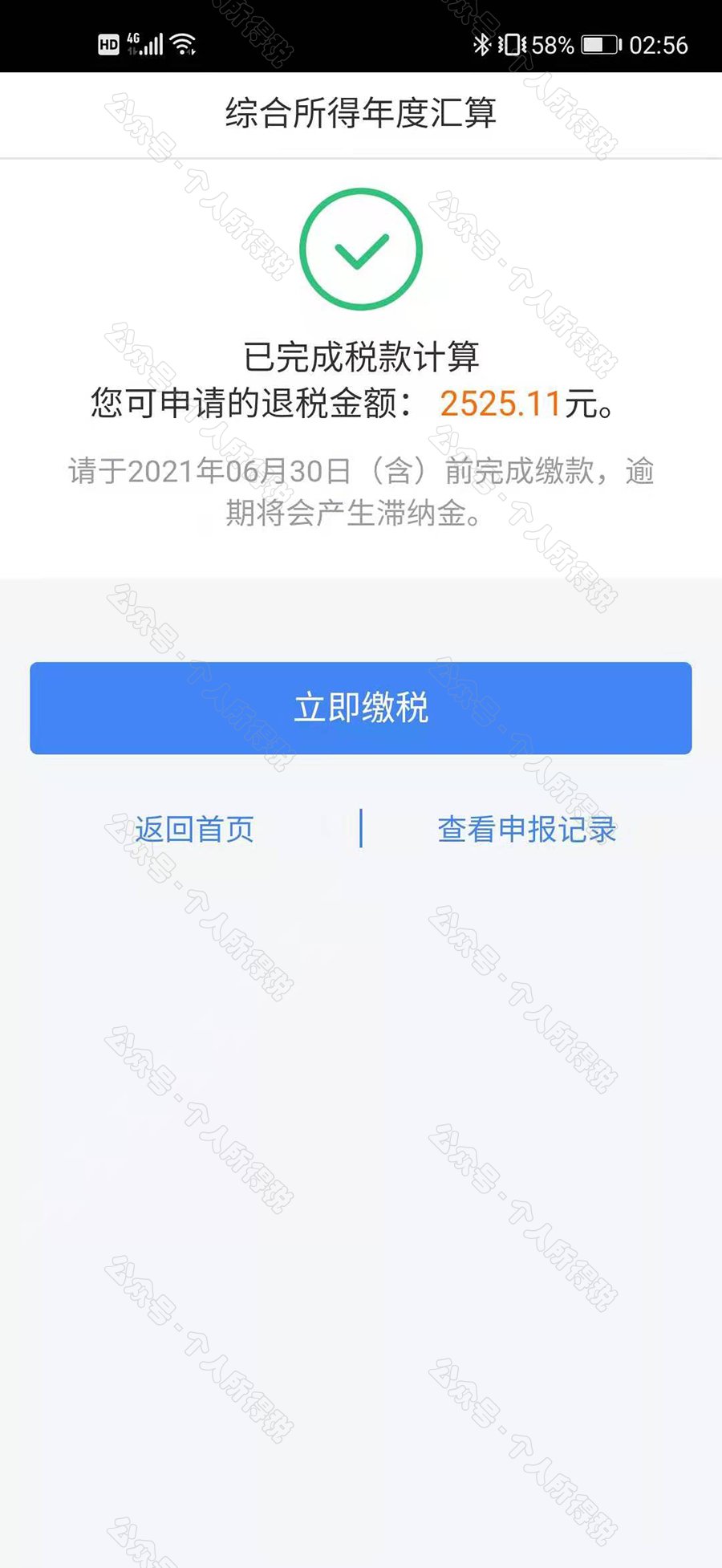 若您存在应补税额但不符合免于申报,可点击【立即缴税】进入缴税。