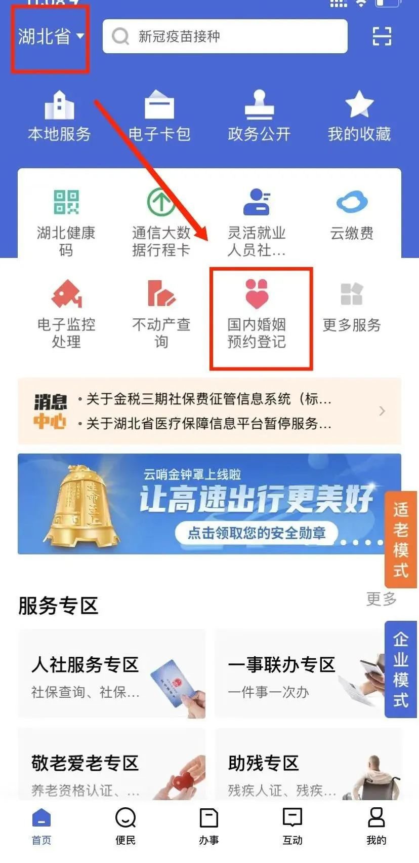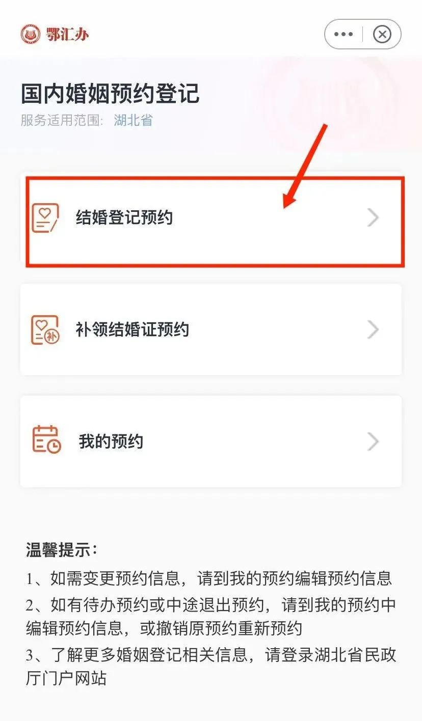 1.手机下载鄂汇办APP,点击左上角,将地区切换为“湖北省”,再点击进入“国内婚姻预约登记”。
