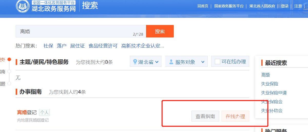第一步,登录湖北政务网(http://zwfw.hubei.gov.cn/s/index.html),在湖北政务网内,搜索离婚即可;