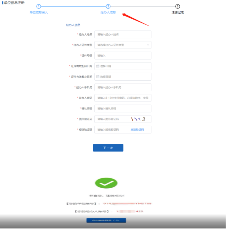 3.录入经办人信息,录入完毕后点击下一步完成注册。