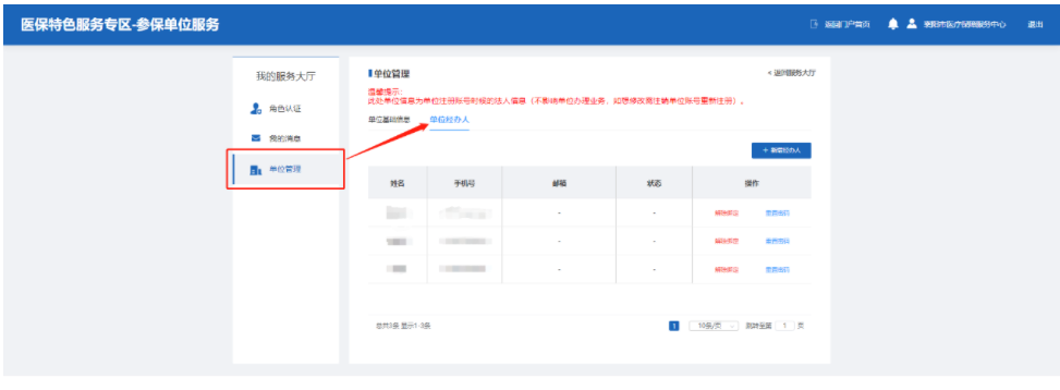 1.点击单位管理→单位经办人,可在此添加/解除经办人。