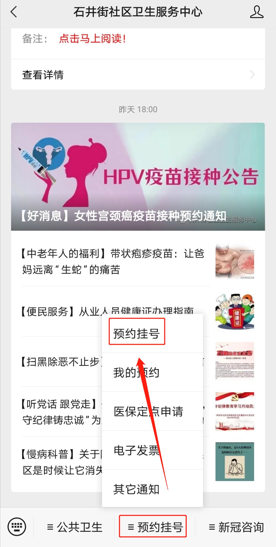 从2021年9月开始,石井街社卫中心宫颈癌疫苗接种预约方式调整为在微信公众号上预约,其他预约方式无效。预约流程如下:
