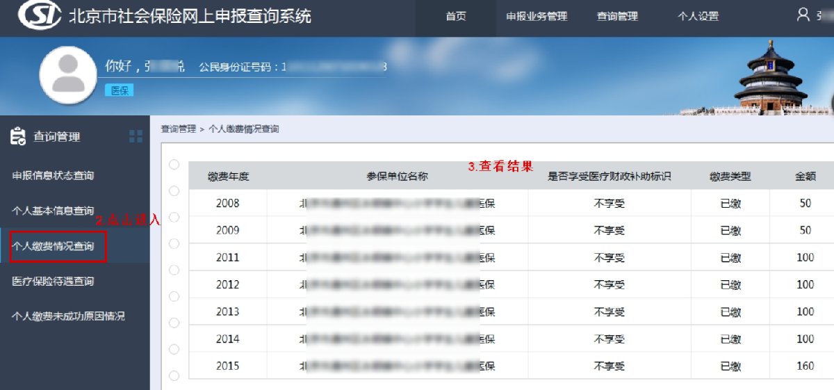 点击查询管理,点击个人缴费情况查询进入,查看结果。