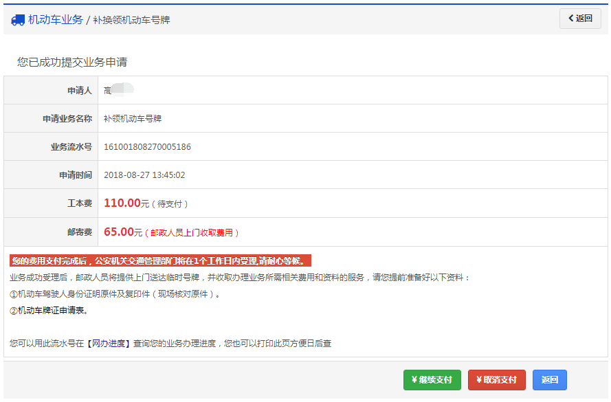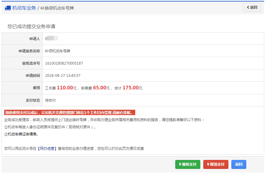 如果平台支持在线缴纳工本费与邮费且选择在线缴费,提交完成后显示如下: