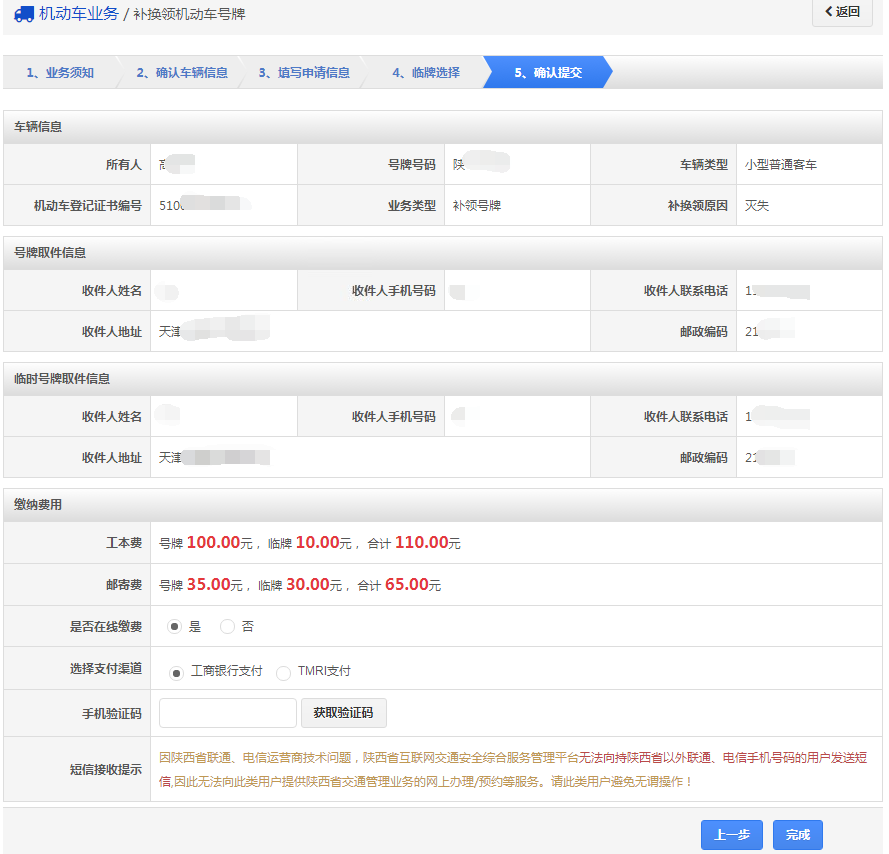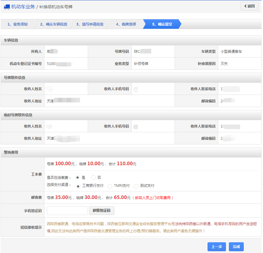 再次确认信息以后,点击【获取验证码】,系统会发送6位验证码到用户绑定的手机,用户输入手机验证码后,点击【完成】,进入步骤6【完成提交】。如果选择在线支付,提交后自动跳转至支付页面进行网上付款。