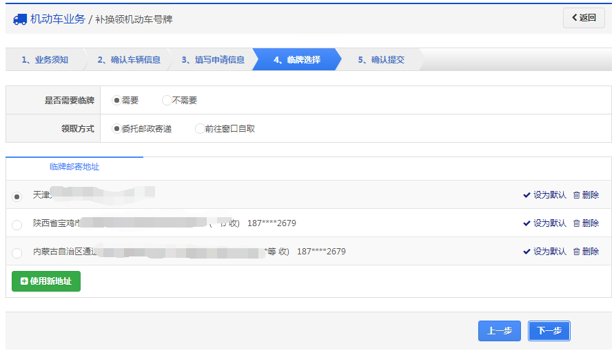 在该步骤,用户填写业务类型、申请原因、是否需要临牌、取件方式、临时号牌邮寄地址和机动车号牌上牌点等资料信息。如下图所示,确认后点击【下一步】按钮进入步骤4【确认提交】。