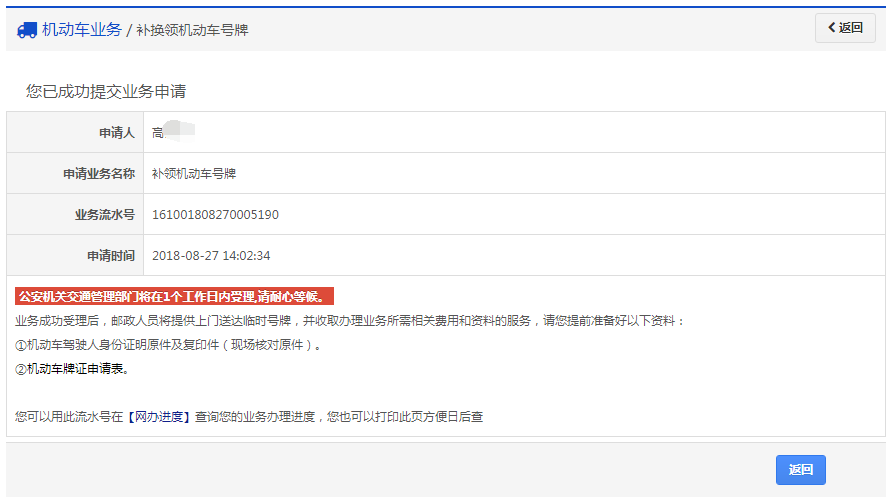该步骤提交成功后,系统生成业务流水号。该步骤提交成功后,系统将于提交后的一个工作日(不含当天)受理(选择在线支付的业务费用支付完成后受理),届时会发送短信告知受理结果。用户可以根据该业务流水号在网办进度中查询业务办理进度。