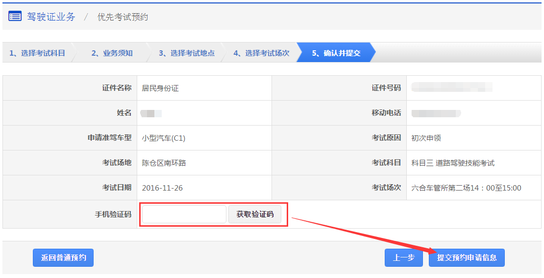 步骤6:【确认并提交】返回该步骤显示用户的预约信息,再次确认信息以后,点击【获取验证码】,系统会发送6位验证码到用户绑定的手机,用户输入手机验证码后,点击【提交预约申请信息】完成考试预约。