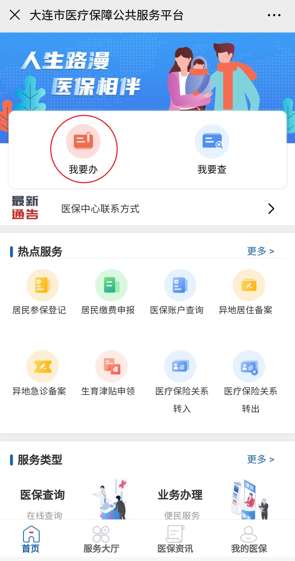 1、第一步:关注“大连市医保局”后,从“服务大厅”进入,点击“我要办”,选择“医疗保险关系转入”