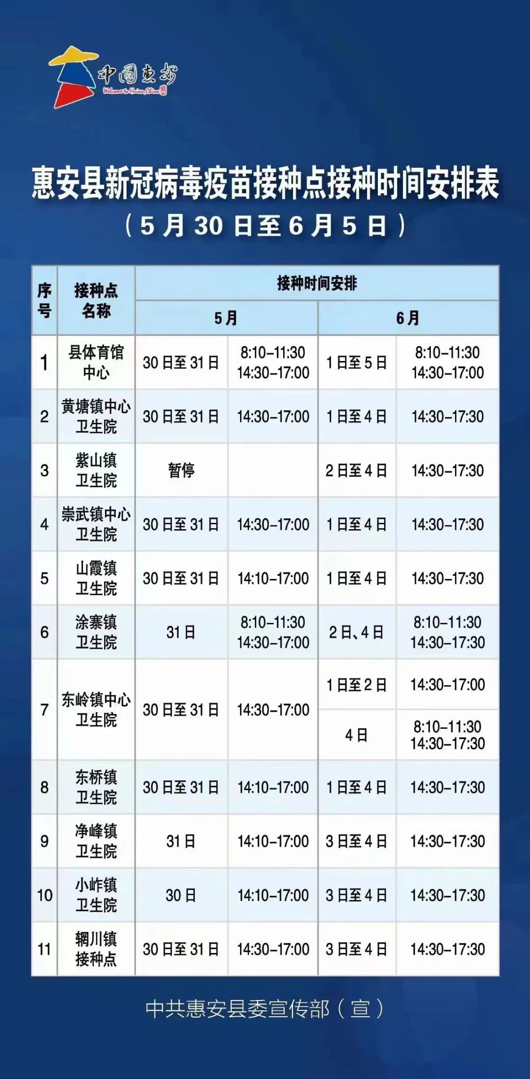 惠安县新冠病毒疫苗接种点接种时间安排表