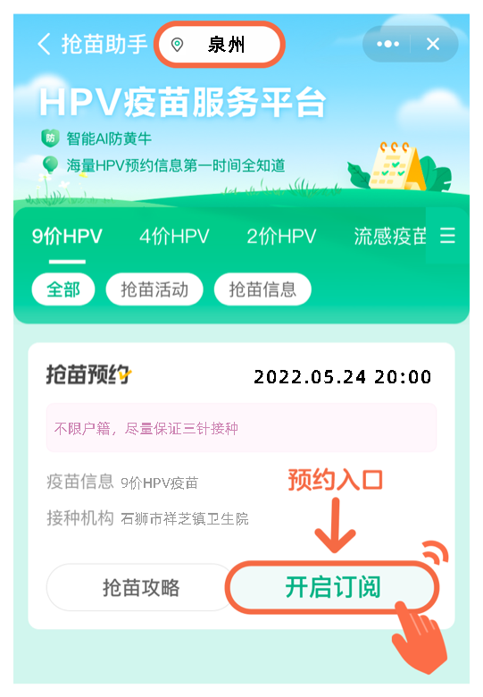 疫苗开放预约时,订阅按钮将变为预约入口,点击立即预约