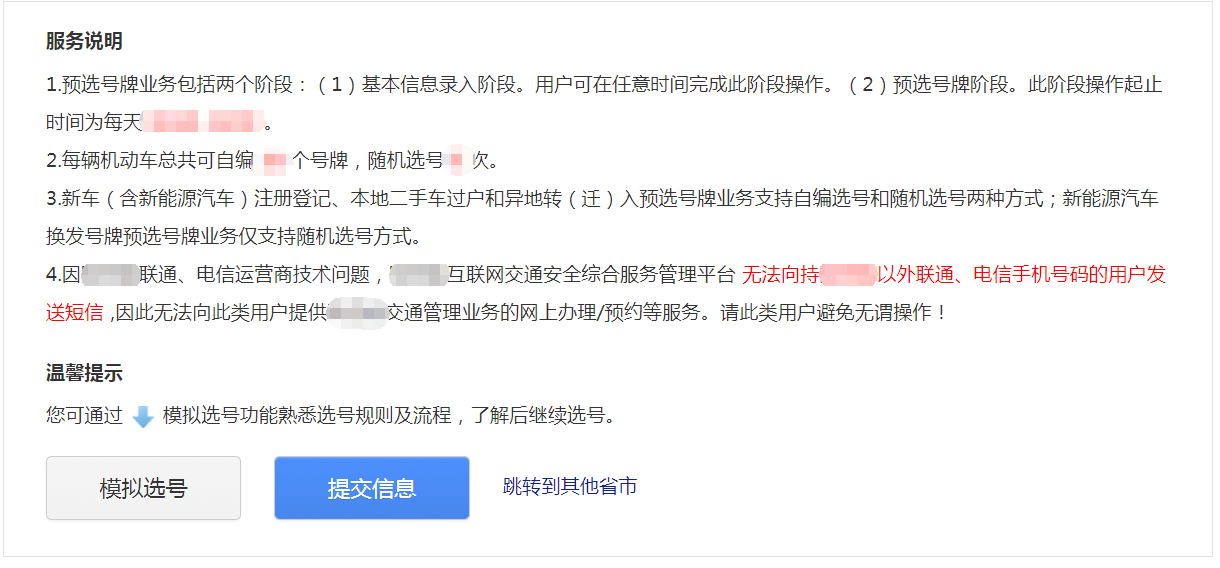 用户首次进入预选号牌业务,系统将显示预选号牌服务说明页面,如下图所示:
