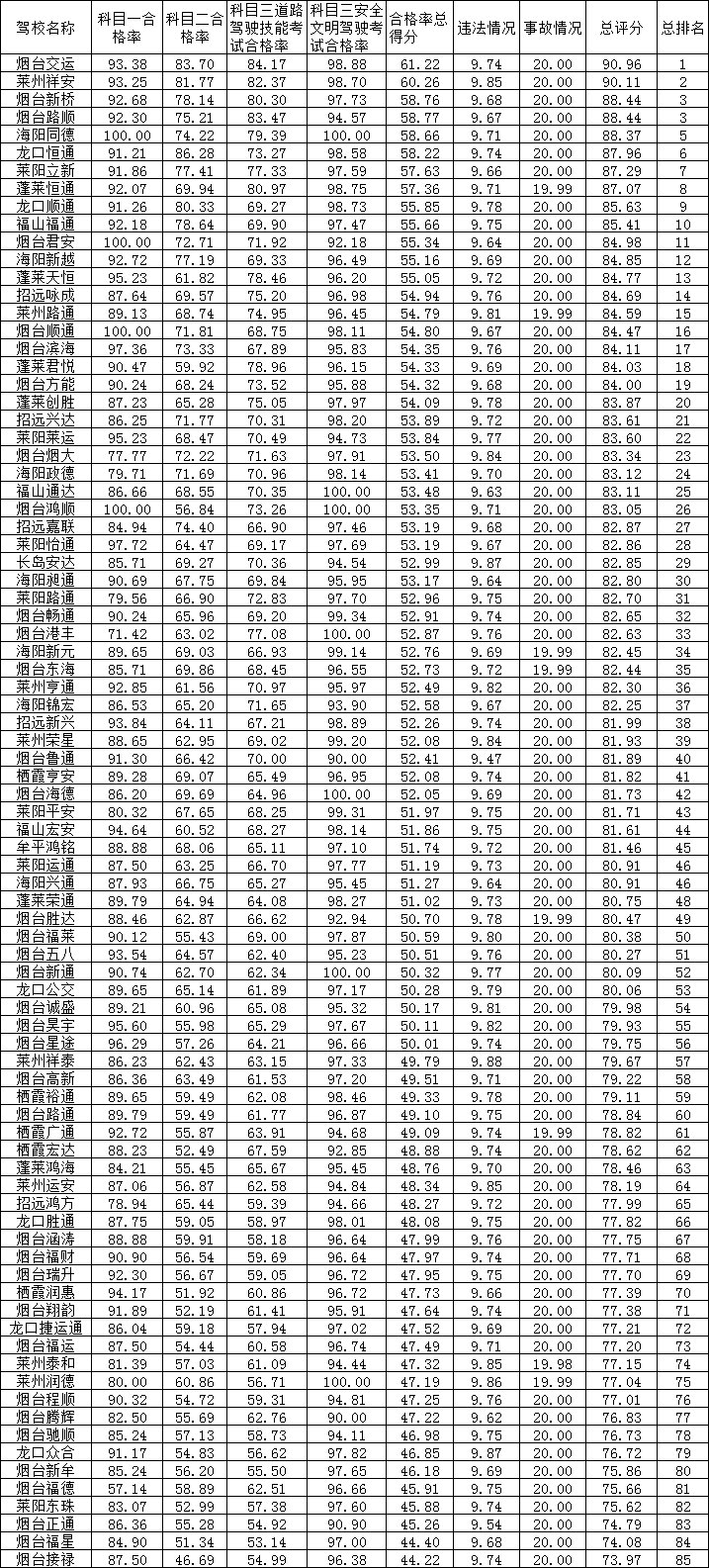 烟台最新驾校培训质量排名表
