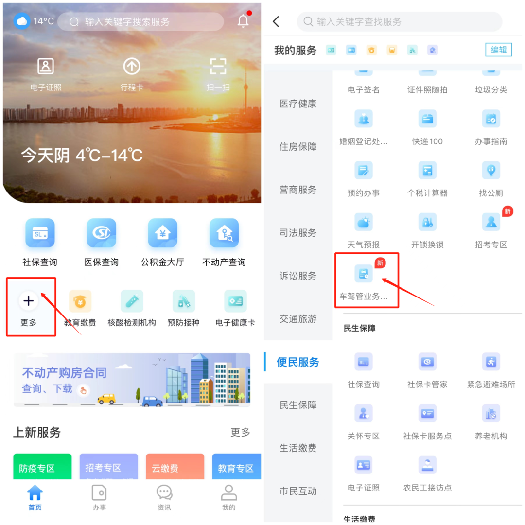 (二)在首页位置点击【更多】,在【便民服务】中找到【车驾管业务预约】