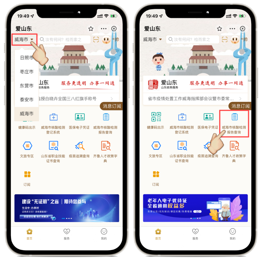 2、进入小程序后,点击首页左上角选择【威海市】,然后在首页点击进入【威海市核酸检测报告查询】服务。