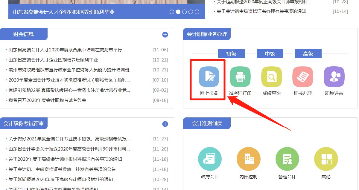 登录山东会计信息网,点击首页“初级专业资格考试”-“网上报名”