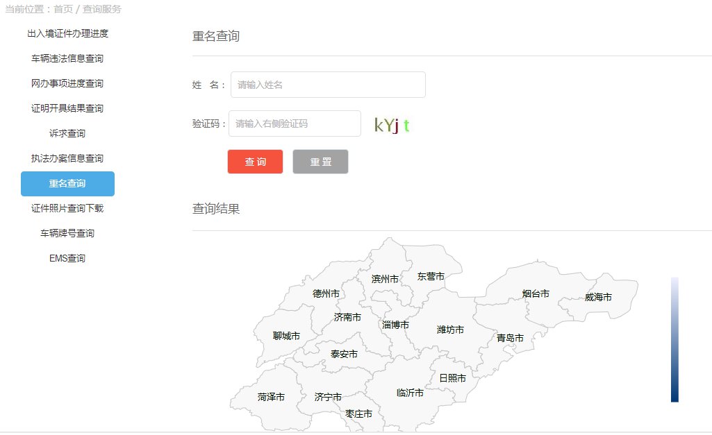 登录网址(http://gat.shandong.gov.cn/msjw//searchservice/index.shtml),点击“查询服务”-“重名查询”。