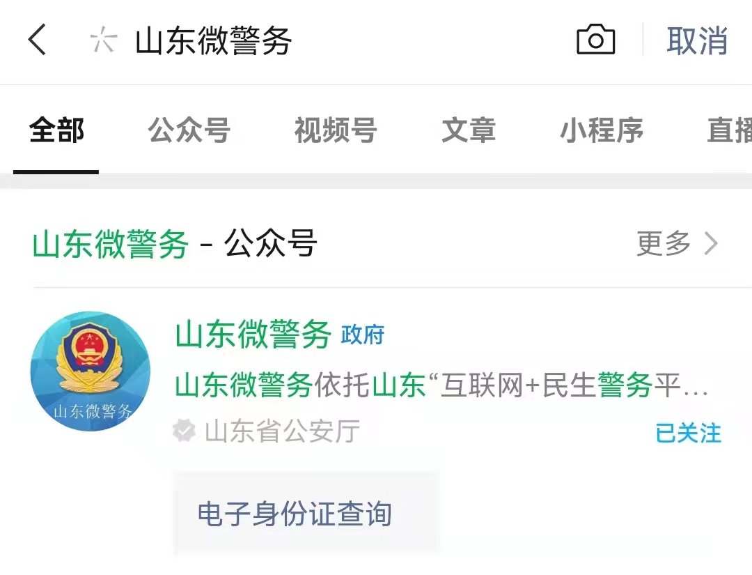 1、微信搜索“山东微警务”并关注。