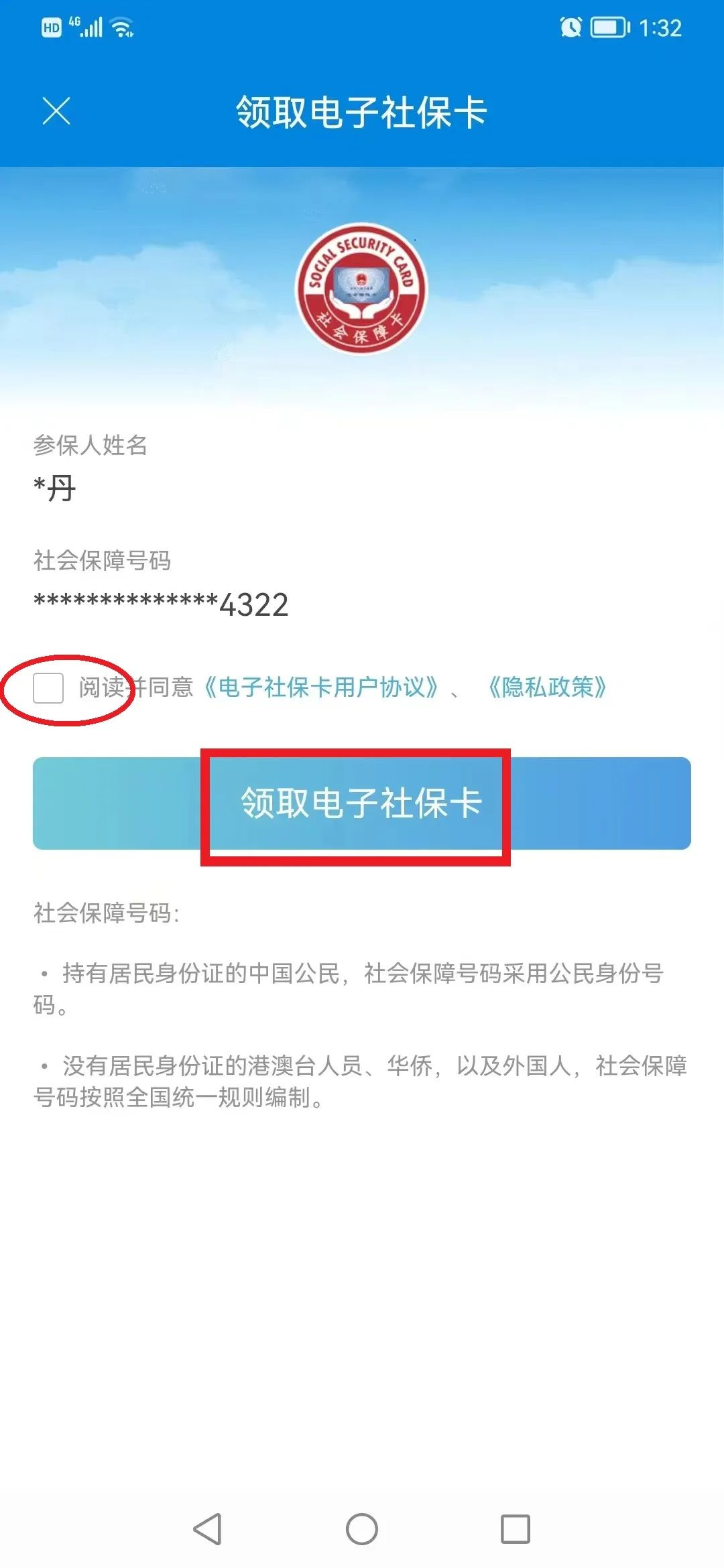 8、阅读并勾选同意协议后,点击[领取电子社保卡]。