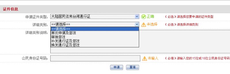 3、在申请证件类型的下拉框选择“大陆居民往来台湾通行证”详细类别的下拉框选择“单独签注”
