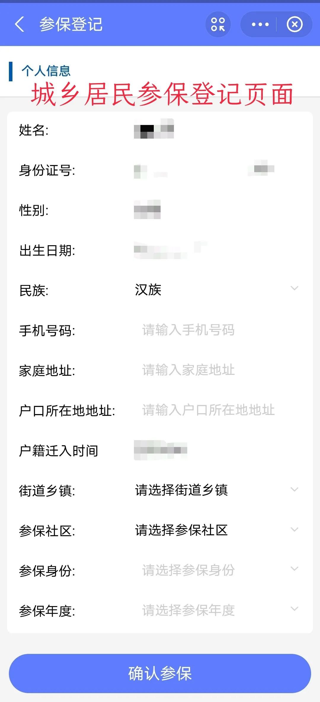 进入城乡居民参保登记页面,在此页面准确填写自己的个人信息,在选择参保身份时依据自身的实际情况来进行选择,信息填写完成并且核对无误后后点击“确认参保”。