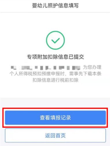 如果纳税人需要在每月发放工资薪金时享受专项附加扣除,需要选择【通过扣缴义务人申报】,并核实扣缴义务人信息是否准确。选择完成后,点击【提交】,即完成3岁以下婴幼儿照护专项附加扣除填报流程,系统将弹出【专项附加扣除信息已提交】的提示。纳税人可以点击【查看填报记录】查看已经申报的专项附加扣除信息。
