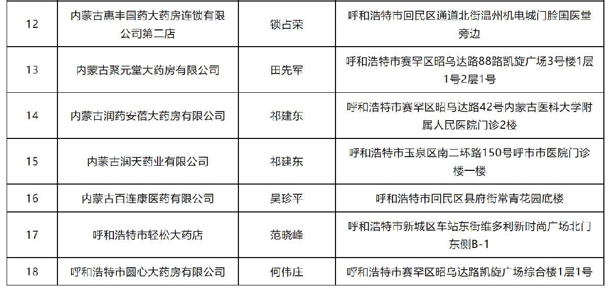 呼和浩特市基本医疗保险特殊药品定点零售药店名单