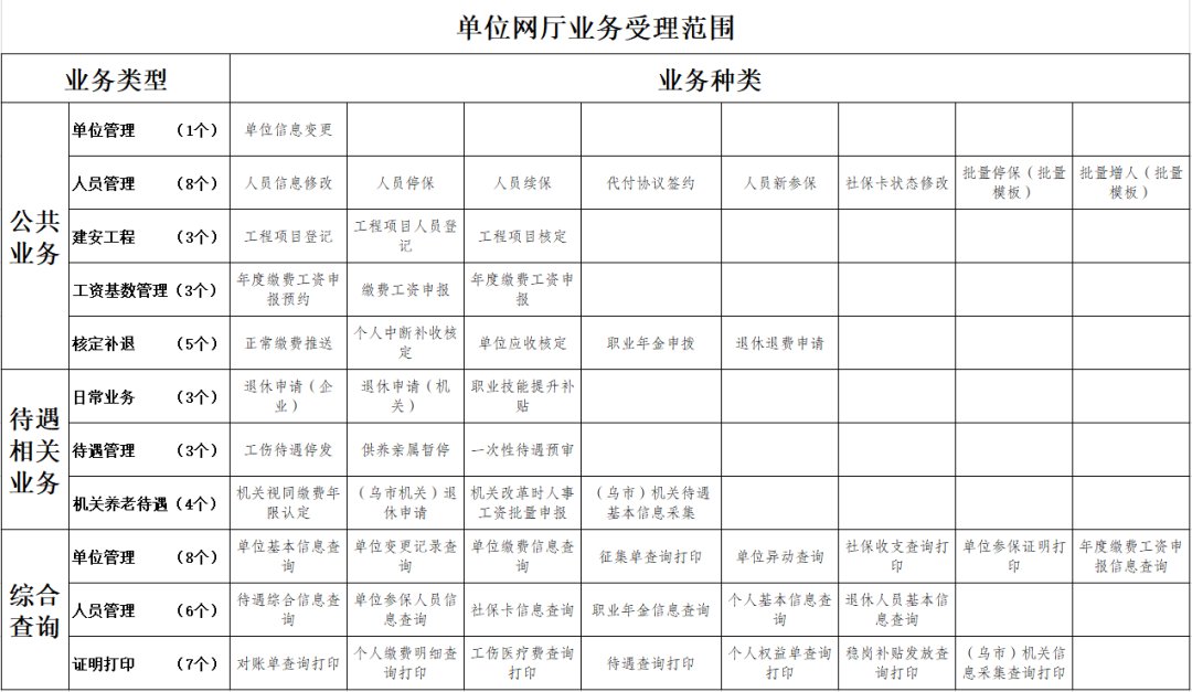 参保单位可通过新疆人力资源和社会保障网上办事大厅(点击进入)办理单位信息变更、缴费工资申报等20项公共业务,退休申请、工伤待遇停发等10项待遇相关业务及21项综合查询类业务,全面实现足不出户办业务。