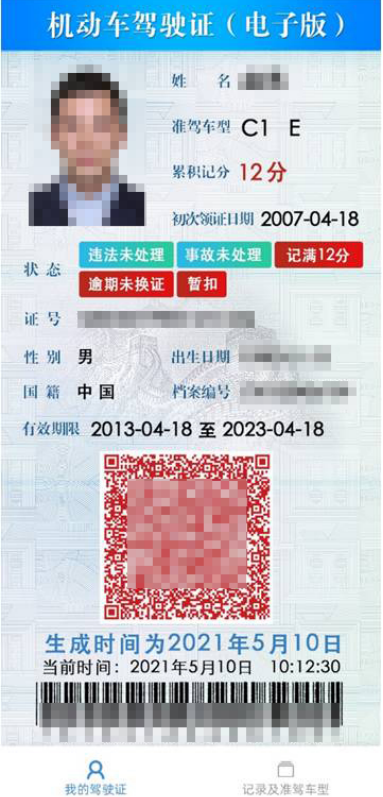 驾驶证状态包含逾期未换证、逾期未审验、记满12分、暂扣、扣留、扣押等不能正常使用状态的,二维码颜色为红色。