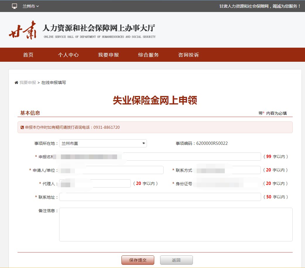 在联系地址一栏填写本人现详细住址,在备注信息栏务必准确填写原工作单位全称及本人社会保障卡号,信息填写确认无误后点击【保存提交】,申报事项将传入后台经办系统由经办机构工作人员进行审核。本人进入甘肃人力资源和社会保障网上办事大厅首页,点击右上角“综合服务”进入,点击“办件审批查询”,再点击“查看办件”,即可查看办理结果。