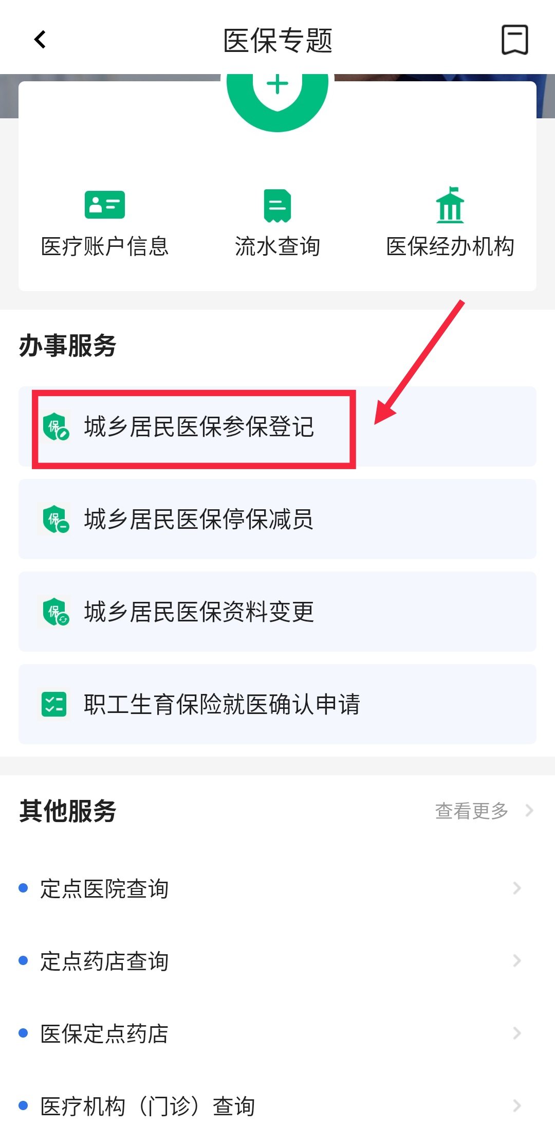 第四步:在【办事服务】页面中找到“城乡居民医保参保登记”,如下图所示;