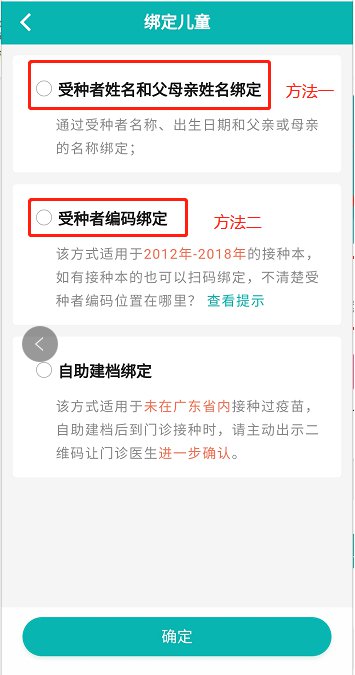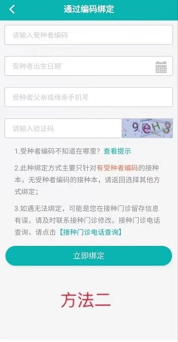 按上图内容填写小孩个人信息,方法二中“受种者编码”为小孩《接种证》上黏贴的条形码。
