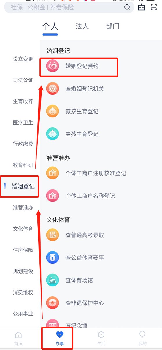 3、点击APP首页下方的【办事】栏,在左侧办事栏目找到【婚姻登记】,选择【婚姻登记预约】。