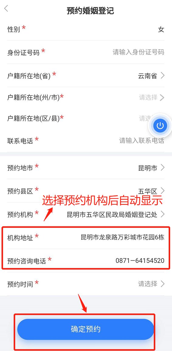 5、分别输入结婚登记双方信息,包括姓名、身份证号码、户籍所在地、联系电话等信息,选择预约地市、县区以及预约机构,系统会自动匹配机构地址及预约咨询电话,并勾选预约时间。填写完毕检查无误后点击【确定预约】即可。