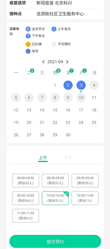 第六步:选择社区医院,并选择相应的时间段进行预约;