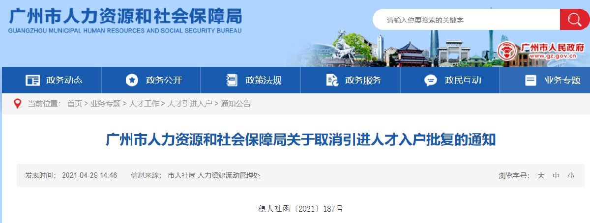 4月29日,广州市人社局官网发布了《广州市人力资源和社会保障局关于取消引进人才入户批复的通知》,通知决定取消引进人才入户批复。