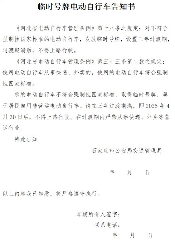 石家庄临时号牌电动自行车告知书模板如下:
