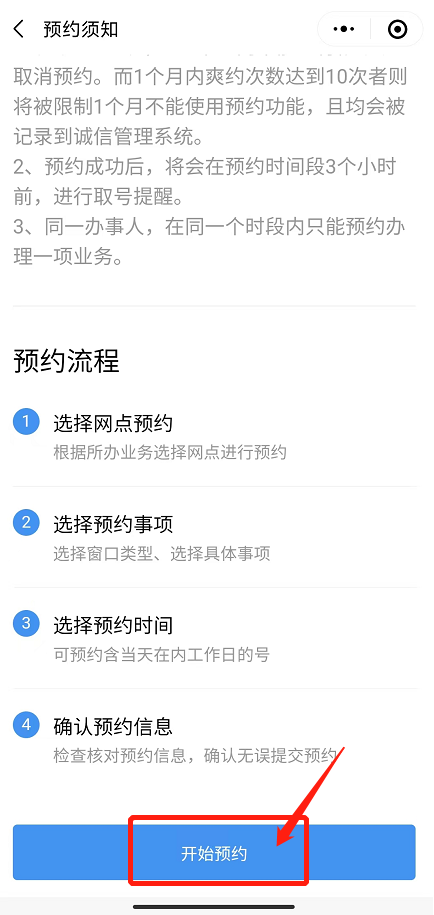 2、阅读预约须知完相关内容,点击【开始预约】。