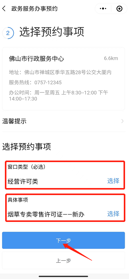 4、选择预约事项:选择窗口类型及具体事项,点击【下一步】;
